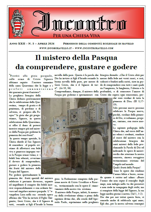 È disponibile (scaricabile in allegato) il numero di Aprile 2026 del periodico della Comunità ecclesiale di Ravello: “Incontro per una Chiesa Viva”.