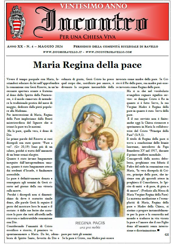Due articoli relativi alla cronaca parrocchiale: “San Pantaleone di maggio: la festa dei ravellesi” e “Maggio: mese mariano”, a firma di Lorenzo Imperato e Rosanna Amato, raccontano due esperienze importanti della vita cristiana a Ravello vissute nel mese consacrato a Maria.